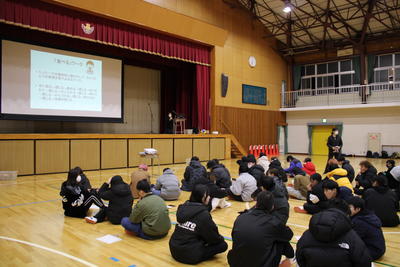 よりよく生きる力を育む心の土台づくりとして、「情報モラル教室」「非行防止教室」を開催し、ネットリテラシーや規範意識の向上を図りました。また、地域文化への理解を深めるため、岩屋神社布団太鼓保存会会長様からお話を聞き、生徒は祭りが地域の人々の思いや絆をつなぐ大切な営みであることを知り、文化継承の一翼を担う意識を高めました。