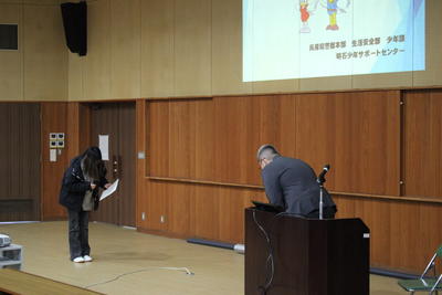 火災や地震が発生した時、教室、体育館、グランド、階段、登下校中などそれぞれの場所でどのような行動をとるべきか。また、日頃からの災害への備え(食料や避難場所、避難所など)を話していただきました。