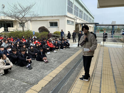 次に、校長先生の講話の中で、阪神淡路大震災、能登半島地震については想定外の規模や被害であったこと、最近では鳥取島根でも地震が起き、私たちはあらゆる場所で地震が起きた時の想定を超える災害を想定するいう考えを持つことが大事だとありました。名谷の標高は約100mですが、三宮の標高は5.4mです。津波がそれよりも高かったら、なども想定する必要があります。南海トラフ地震にも備えなければなりません。自分の命を守り、さらに周囲の人の命を守れる人になってほしい、今日、明日(1月17日)は命の大切さを再認識する日にしてほしいというお話でした。