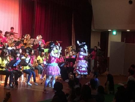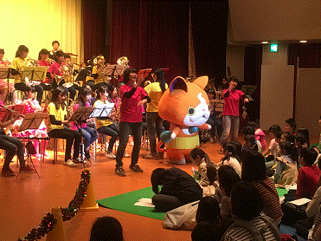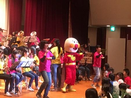 学園都市にある流通科学大学のホールで14時に開演し、ホールを埋め尽くすほぼ満員のお客様にご来場いただき、多くの人に楽しんでいただける演奏会となりました。第1部(約30分)は音楽劇「アナと雪の女王」、第2部は(約20分)「小さな世界」による楽器紹介、第3部(50分)は「ブラボー・ブラス」「ドラゴンクエスト序曲」「キミとアイドルプリキュア!Light up!」「SNSバズりメドレー」「くるみ割り人形より行進曲」「WINNER!ゴジュウジャー!」「スタジオジブリ名曲集」「スケッチ」「アンパンマン・メドレー」アンコール曲「ジャンボリミッキー!」の全10曲を名曲とアニメソングと題して演奏しました。トトロ、ドラえもん、アンパンマン、ばいきんまん、ドキンちゃんなどの着ぐるみやダンス、打楽器や指揮者の体験コーナーなど盛りだくさんの演出で会場を大いに沸かせました。