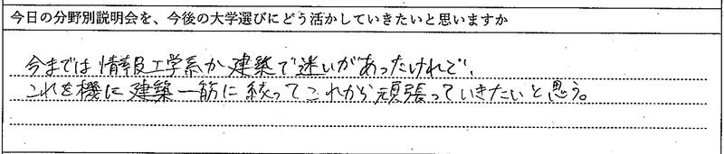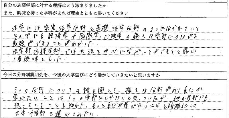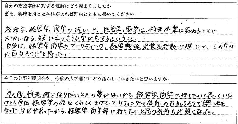 実施後に書いたワークシートにも、大学の学科や研究内容に対する気づきがあったり、理解が深まったという感想が多く、3年次に向けて大学選びの参考になったのではないかと思います。ワークシートの記述については別途、抜粋してHPに挙げています。ぜひ生徒の生の声も聴いてみてください。
