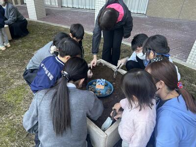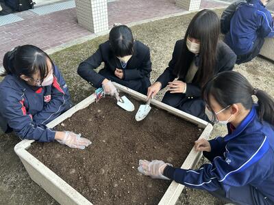 今年度は、秋のオープンハイスクールと名谷駅での配布に加え、すみれ保育園(須磨区中落合)の園児と花植え交流も実施しました。