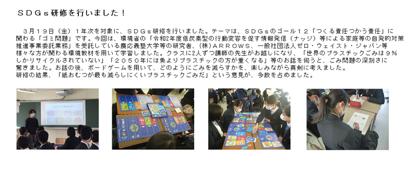 また、今回の集会は、ESD活動メインの集会でした。本校や世界各国が力に入れているSDGsも関係していました。今後、私自身ができることをよく考えて行動したり、環境や他分野の興味があることを私なりに調べたり考えたりしていきたいと思います。