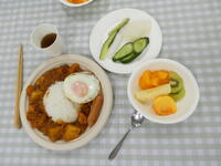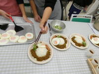 ご飯の配膳のお手伝いで、ご飯、目玉焼き、ウインナー、かいわれ大根の盛り付けをしました。