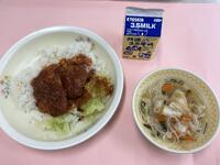 「かつめし」は、加古川市発祥のご当地グルメです。ごはんの上にカツをのせ、特製のデミグラスソースをかけて、ゆでキャベツを添えた洋食です。もともとはビーフカツを使うようですが、今ではトンカツやチキンカツ、エビカツなどさまざまなバリエーションがあるそうです。今日の給食ではチキンカツを使いました。