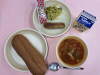 今日はセルフドッグでした。切りこみの入ったコッペパンに、ウインナー、キャベツのソテーをはさんでいただきます。ウインナーは、少し太めのフランクフルトを使いました。ケチャップは、最後にかけたり、具の間に入れたり、とそれぞれ自分だけのセルフドッグを楽しんだようです。