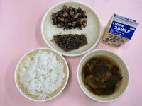 梅じゃこわかめごはん 牛乳 鶏肉とじゃがいもの煮物 野菜とツナのゴマあえ
