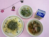 梅じゃこわかめごはん 牛乳 鶏肉とじゃがいもの煮物 野菜とツナのゴマあえ