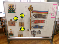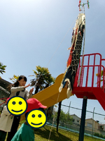 春の空の下、園庭でこいのぼり上げを行いました。「ふきながし、まごい、ひごい、こごい」という名称や、「上げる」「すいすい泳ぐ」という動詞を確認しながら、お友だちとペアになって上げました。風にのって高く泳ぐこいのぼりを見上げながら、子どもたちは笑顔いっぱいでした。