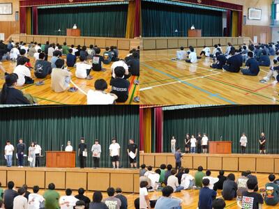 始業式終了後、生徒指導部長の諸注意に続いて柔道部とソフトテニス部の表彰を行いました。