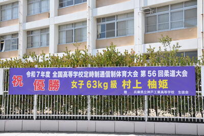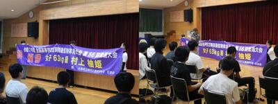 生徒会より横断幕が披露され、全国大会女子柔道63kg級個人戦で優勝した村上柚姫さん(2年生)が受け取りました。