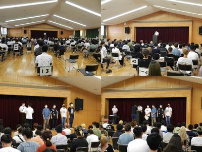 7月20日(火)17時30分より、 体育館において、第1学期終業式・表彰式・生徒会役員任命式および全国大会出場壮行会を行いました。