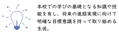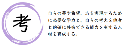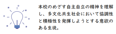 | 自ら立てた志を実現するための自律心と行動力、グローバルな視点とコミュニケーション能力を備え、自主自律の精神に富み、自立して国際社会で活躍できる人材を育成する。 |