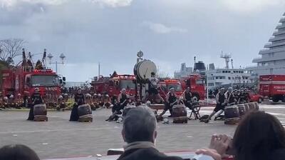 1月11日、和太鼓部は箕谷の左義長に参加させていただきましたが、同時に、5名の部員はメリケンパークで行われた神戸市消防局の出初式に出演しました。