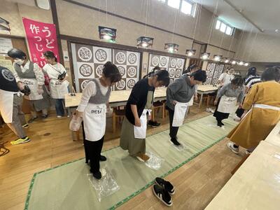 行ったらやっぱりうどんを作らないと!っということで、3人1チームに分かれてうどん学校に入学。