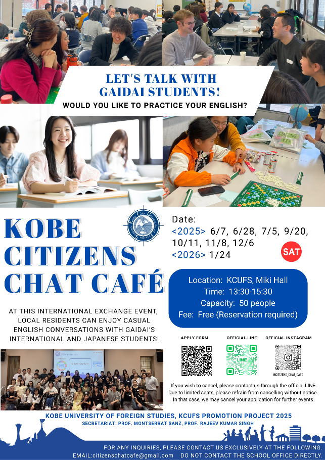 神戸市外国語大学にて、地域貢献と国際交流をテーマにしたユニークなイベント「CITIZENS CHAT CAFE」に英語部5名が参加してきました。参加者と大学生が英語で意見交換を行い、さまざまな文化背景を生かして交流を楽しむことができます。
