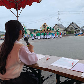 今年で3回目となりますが、今年も香寺高校放送部がこうろ秋祭り屋台大集合の司会を担当させていただきました。例年通り各地区の屋台が香寺事務所の駐車場に集まり、香寺太鼓、犬飼獅子舞、屋台練りをする姿が見られました。放送部はこの総合司会を務め、祭り用語の読み上げに苦戦しながらも無事アナウンスをやり遂げました。