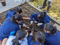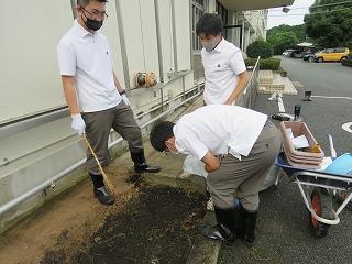 校舎横の花壇の手入れを行いました。今日は、枯れた植物を抜き新しく土を入れる作業をしました。来週にはその花壇に花を植える予定です。