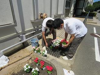 先週土を耕した花壇に花を植えました。暑い中での作業でしたが、先生方にも手伝っていただき短時間で作業を終えることができました。