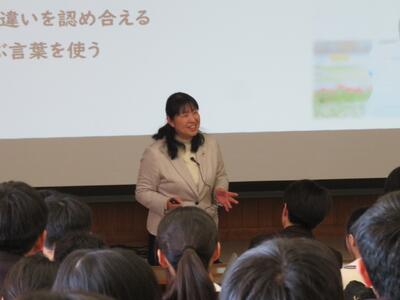12月16日(火)3、4校時 1年次生を対象に「いのちと性を考える講演会」を実施しました。昨年に続き、兵庫県のプレコンセプションケア事業の一環として、講師に公益社団法人「小さないのちのドア」代表理事の永原郁子先生をお招きし、「あなたの将来のために」と題して講演をしていただきました。
