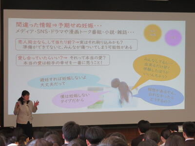 先生は助産師として、また予期せぬ妊娠に悩む人々の相談事業に携わってこられたご経験から、恋愛におけるパートナー選びの大切さ、DVや妊娠中絶の問題など多岐にわたってわかりやすく語られました。自立の一歩手前の高校生が、性に関する間違った情報に左右されることなく、自分らしい健やかな人生を送れるよう熱心にご指導くださいました。