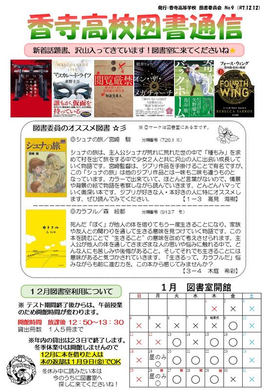 令和7年度 香寺高校図書通信 第9号を掲載します。