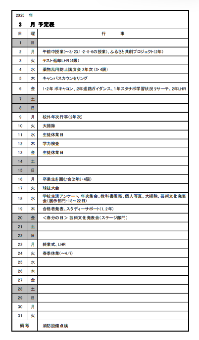 令和7年度3月行事予定を掲載しました。