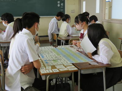 「仕事・職業を知る」をテーマに仕事・資格パズルワークを行い、その後タブレットを使い適性・適職ワークを行いました。グループで話し合いながらワークを進めるなかで初めて聞く職業も多くありました。1年次生の今後の進路選択にも参考になります。