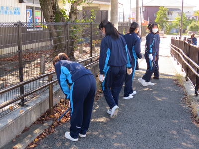 考査最終日に、普段から利用している通学路と校内の清掃活動をグループに分かれて行いました。秋晴れの好天のもと清掃活動に熱心に取り組みました。