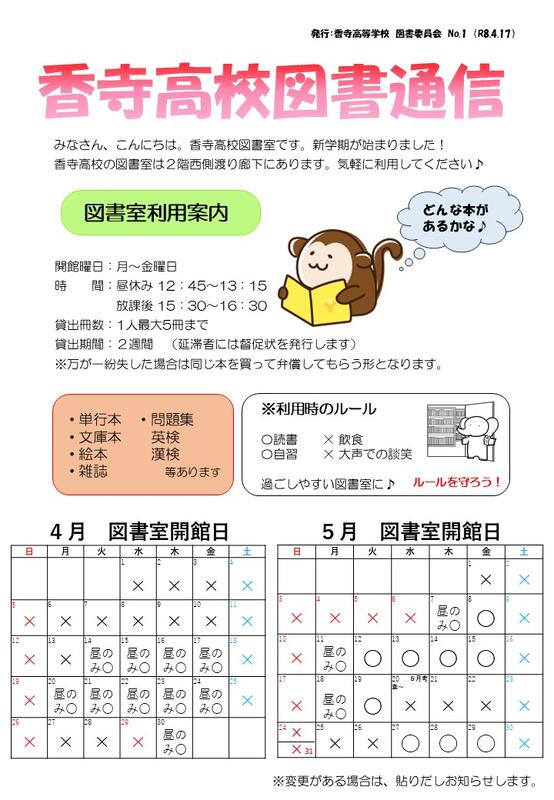 令和8年度 香寺高校図書通信 第1号を掲載します。