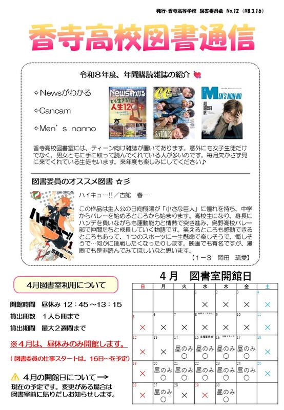 令和7年度 香寺高校図書通信 第12号を掲載します。
