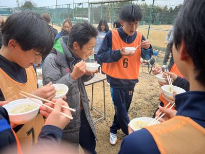 試合後には、保護者の皆様が準備してくださった温かい「豚汁」を全員でいただきました。学校に設置されてある「災害用ベンチ」をお借りし、火起こしからお手伝いいただきました。チームの結束をより一層強める素晴らしい時間となりました。心温まるサポートをいただいた皆様に心より感謝申し上げます。