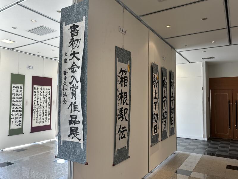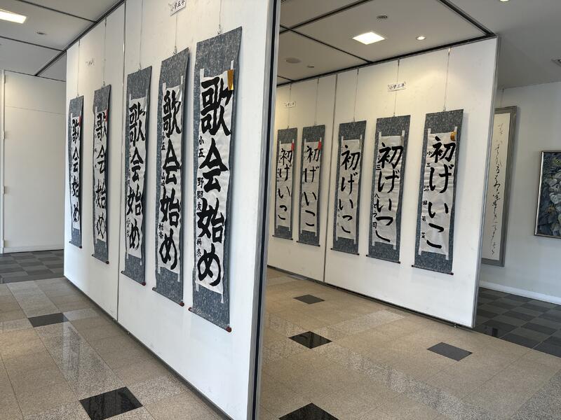 1月4日(日)に同所で行われました「第44回新春書初め大会」へ参加した小中学生の作品も展示されています。