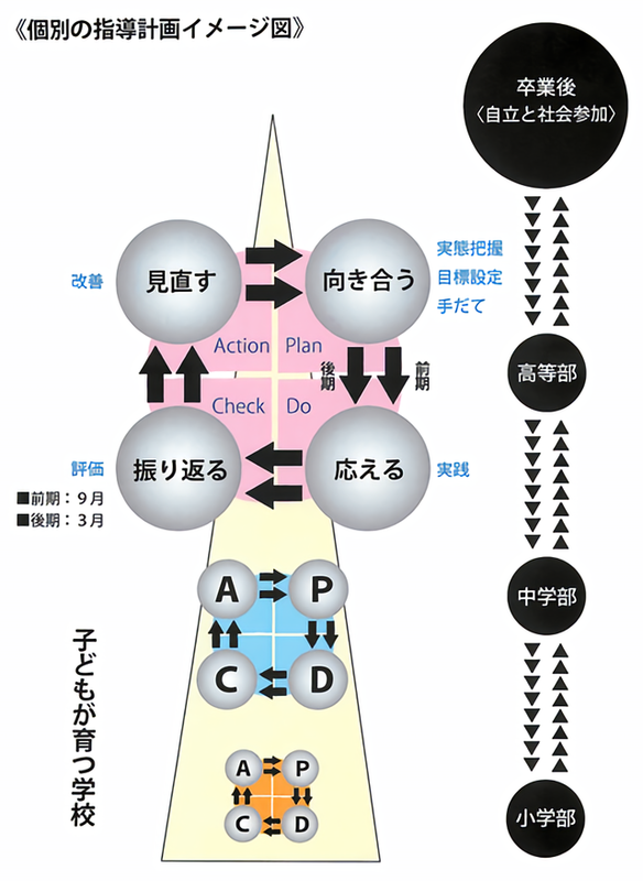 児童生徒一人一人の可能性を可能な限り伸ばし、社会の一員として自立し、自己実現と共生に向けて主体的な取組が行えるよう、教育的ニーズに応じた的確な指導と支援を行う。