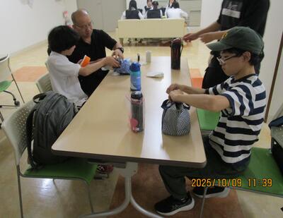 9月30日、「心のバリアフリー推進事業 職業体験」として、セブンイレブンの方をお招きし、仕事の心構えや挨拶の仕方などを学びました。セブンイレブンの制服を着て、大きな声で挨拶の練習をしました。他にケミカルキャップ作業や机拭きなどの軽作業も併せて練習しました。