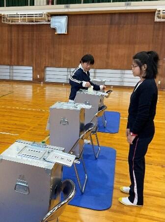 令和7年12月16日(火)児童生徒会役員選挙が行われました。動画での立候補者の演説を聞いた後、小学部4年~中学部3年は体育館で顔写真の貼られた投票箱の中から1つを選び、投票用紙を入れる方法で行いました。高等部1年~3年は、投票用紙に1名の名前を記名して投票箱に入れました。投票箱と記載台は、実際の選挙で使われている物を借りて本当の選挙さながらの雰囲