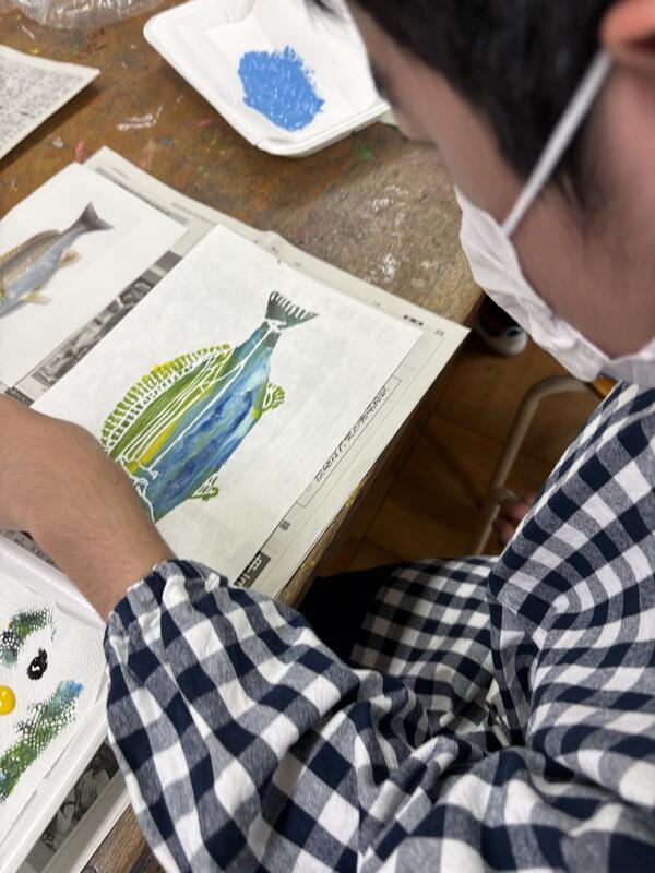タイトルは「わたしの好きな動物」で、ウサギやネコ、魚など思い思いの生物をスチレン版に彫って表現しました。この作品は「みんなのアート展」で展示予定です。出来上がりを楽しみにしていてください。