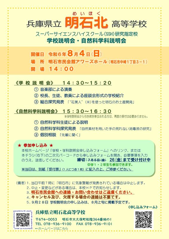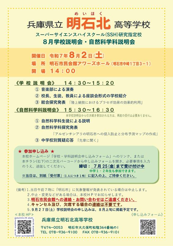 女性も含め、未来を担う若手研究者が活躍できる環境づくりについて、男女が共に語り合う<明石北高校独自の取り組み>です。明石北高校の生徒や兵庫県立大学の学生・留学生と交流するほか、企業や大学で最先端の研究をおこなっている先生方のお話も聞くこともできます。理系系分野の夢や志を持つ中学生のみなさんの、積極的な参加をお待ちしています。