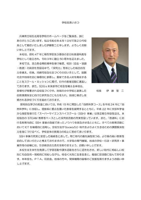 ・8月2日(土)に明石市民会館で学校説明会を開いたところ、1000名近くの方が来場してくれた。今後は、今月27日(土)、11月5日(水)、11月6日(木)に本校にてオープンスクールを実施する。生徒諸君の協力をお願いする。