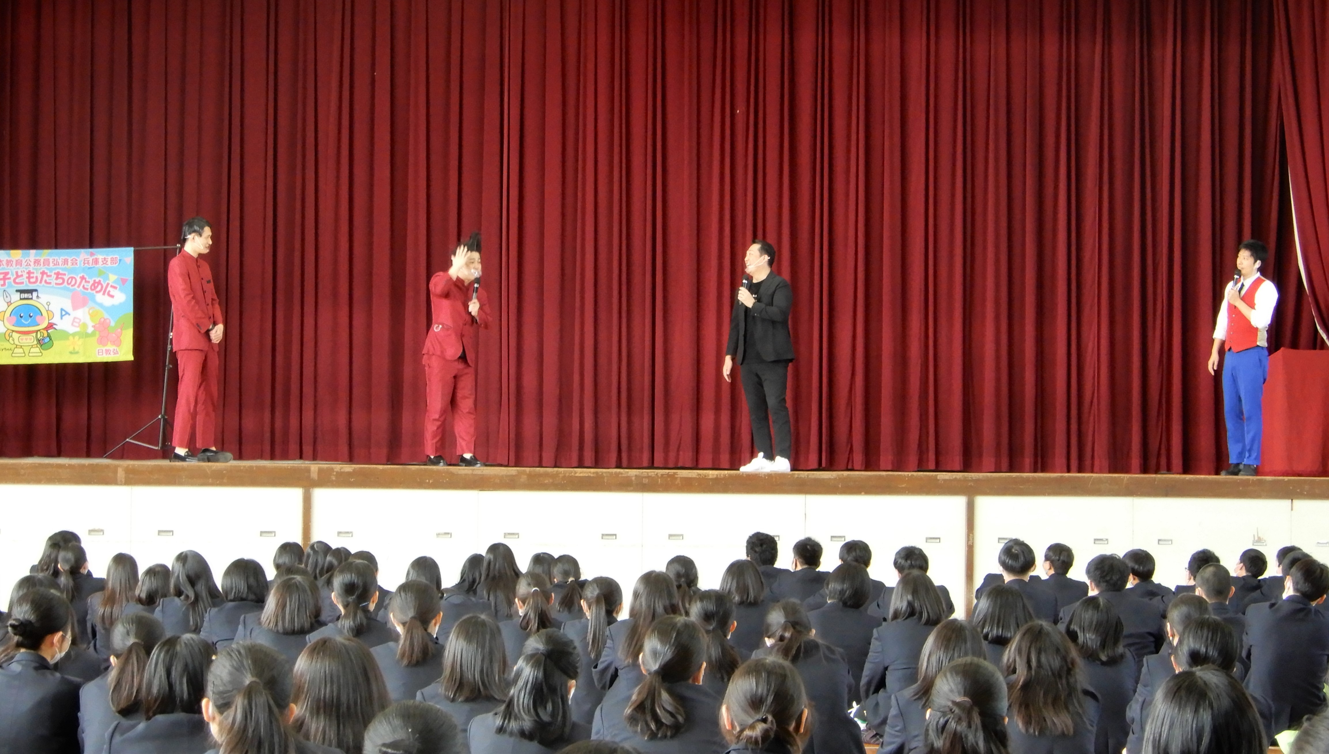 3月8日(月)4校時、学年集会と聞かされて体育館に集まった2年生。そこへ登場したのは、吉本興業のお笑いコンビ「コウテイ」。何が起こったのかわからず、あっけにとられる生徒たち。15分の持ち時間、メンバーの下田真生さんのダイナミックな動きと表現力、九条ジョーさんの甲高い声の自由奔放なセリフに、生徒たちは終始引きつけられた。