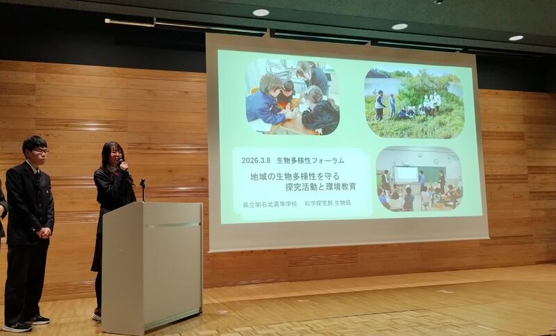 2026年3月8日(日)に神戸市の中央区文化センター(1階多目的ルーム)にて、「生物多様性フォーラム」(神戸市・明石市共催)が開催され、本校の科学探究部生物班(以下、生物班)の生徒が代表して、本校における生物多様性に関する取組(特定外来生物および絶滅危惧種に関する探究活動と環境教育)について発表しました。