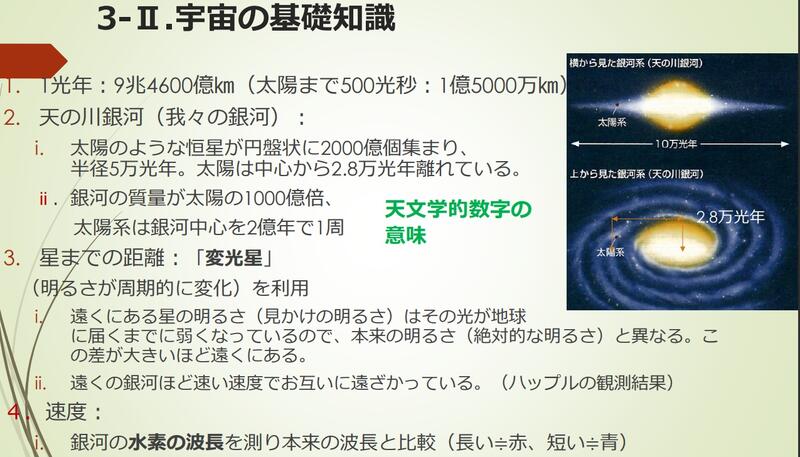 神の一撃(ビッグバン)で始まった宇宙が、とてつもなく短い時間でとてつもなく大きく膨張し、いまだに広がり続けている、ということを聴き、想像を絶する壮大な話に興味が尽きませんでした。質量換算で宇宙の数%(約4%)のことしか人類が理解できていないことにも驚きでした。講義の最後には人類の存在の意義についても触れ、哲学的なおもしろさも感じることができ、非常に有意義な講義となりました。