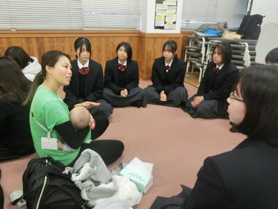12/17水 赤ちゃん先生(1年教育類型) 投稿日時 : 12:04 明石西高校教員 カテゴリ:教育類型 地域からお母さんと赤ちゃんをお招きし、育児体験をしました。 ベビーカーを押したり、座談会でお母さんの話を聞いたりと、育児の大変さと喜びを感じることができました。 男子生徒の「自分の母親に感謝したい」という言葉が印象的でした。