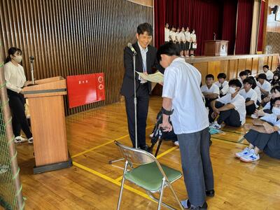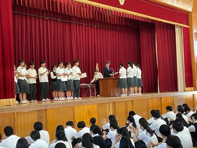表彰伝達は夏休み〜10月初旬までの部活動の大会やスピーチコンテスト、英検など、