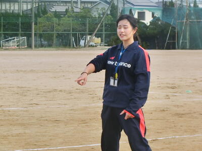 男子のサッカーで、アウトサイドでの蹴り方やドリブルの方法を指導をしています。