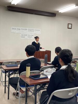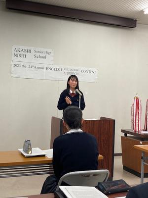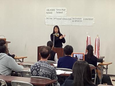 The 21st Junior High School English Recitation Contest was held at Akashi Nishi Senior High School on September 27, 2025. Twenty-two students joined the standard section (一般部門)and four students joined the experienced section (特別部門)