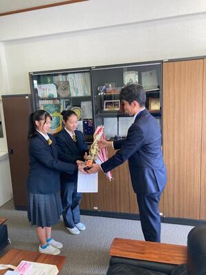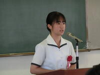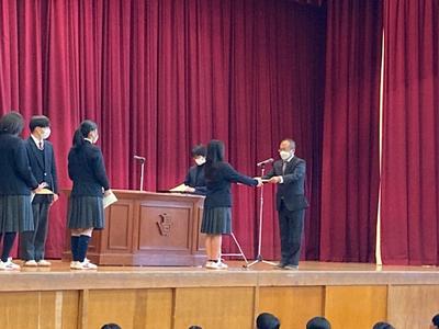 First, two award winners of Toban-Deistrict English speech contests received their certificates; Ms. NAGANO Kokomi received the third prize of the contest, and Mr. TSUJITA Riichi got the certificate of the fourth place.