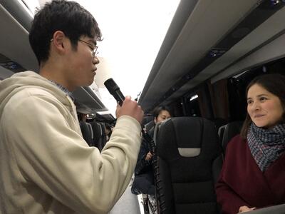 オックスフォードへ向かうバスの中でも、現地ガイドのナタリーさんが街の風景や歴史などを分かりやすい英語で説明してくださいました。生徒もナタリーさんの話が始まると、話をやめてしっかり聞いていました。