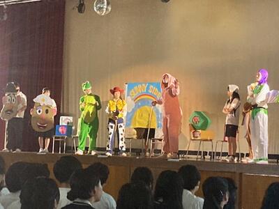 At 14:05, the ESS (English Speaking Society), which many DGA class members belong to, held a play titled, 'Toy Story 3'. The audience enjoyed a funny story performed by students and two ALTs. It was made easier to understand by Japanese subtitles on a screen.