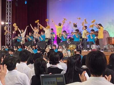 Then the brass band played several songs. One of them was 'Matsuken Samba.' Teachers of the third year appeared and sang and danced to the music. The students were amused and excited at the performance.